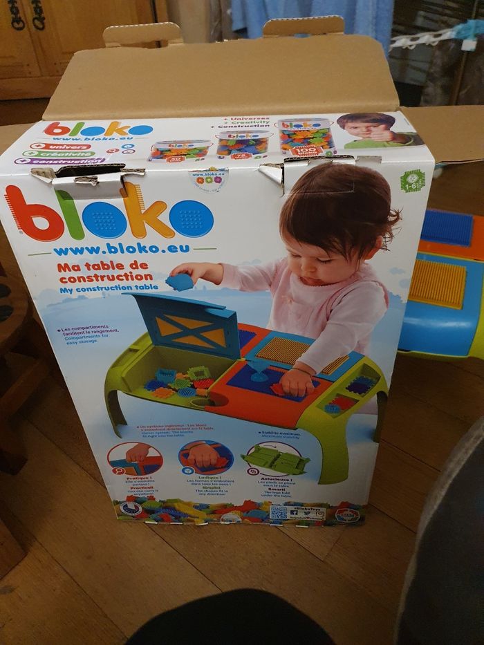 Table de construction Bloko en très bon état vendue avec sa boîte d'origine. Table vide comme indiqué sur l'emballage. Pieds amovibles. Fonctionnent parfaitement . Possède 4 compartiments de rangement. Convient pour enfants de 1 à 6 ans