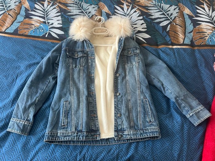 Veste avec fourrure douce bleu jean, elle est en très bon état .