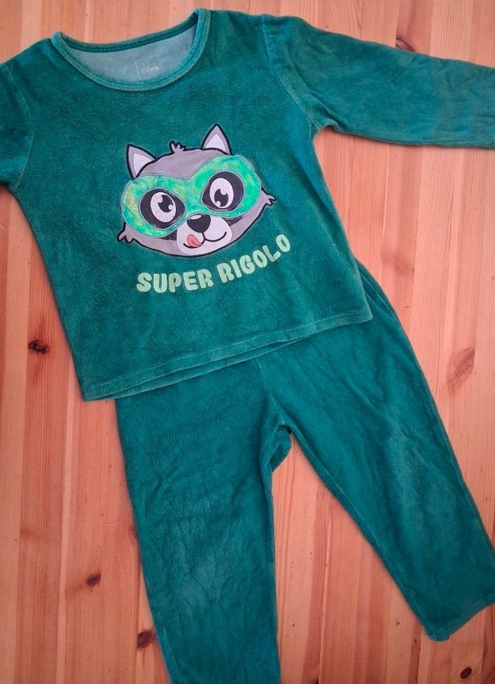 Pyjama en bon état. Un petit accro et la couleur noir qui s'enleve du dessin. PAS DE TROU. Taille 3 ans.