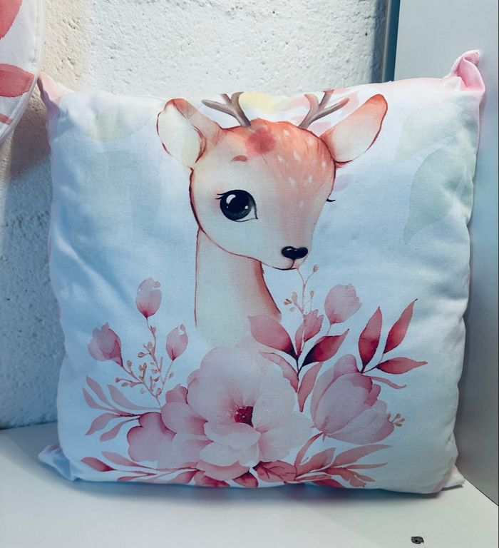 Coussin 40x40cm en coton à motifs et minky rose. Possible de personnaliser avec une broderie, un flocage ou une sublimation.