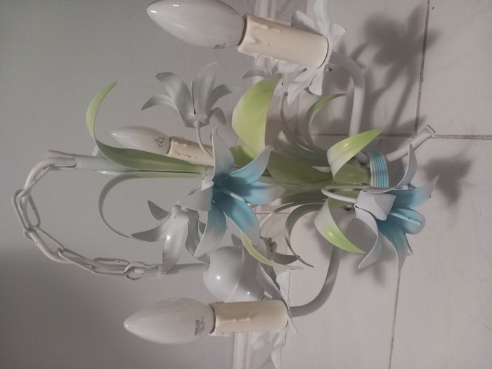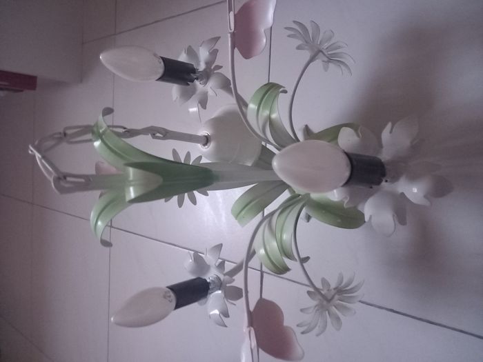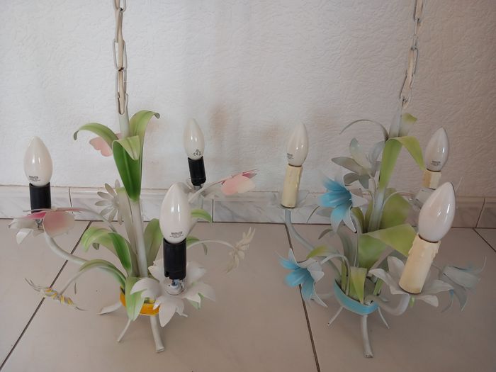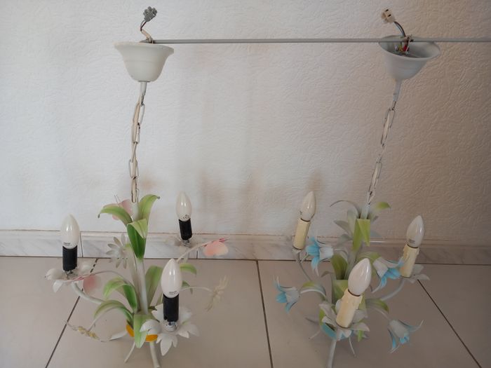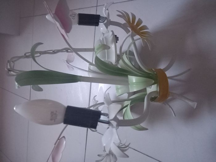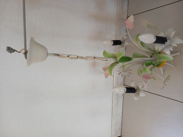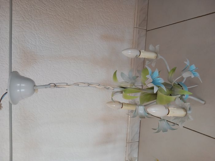 2 Lustres à 3 branches avec lampes Motifs fleurs 1 lustre à 15€ ou les 2 lustres à 25€ TRES BON ÉTAT
