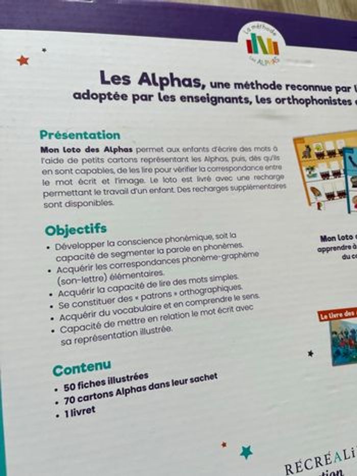 🧩 Mon Loto des Alphas est un incontournable de la méthode de lecture Les Alphas, conçu pour les enfants dès 4 ans. Ce jeu éducatif permet de travailler la conscience phonémique de manière ludique en s’appuyant sur l’univers attachant des Alphas. 📌 À travers 50 fiches illustrées organisées en 6 niveaux de difficulté, l’enfant apprend à : Identifier les sons à l’oral, Associer les bons personnages Alphas à chaque son, Reconstituer des mots simples en posant les jetons dans l’ordre. Complet en très bon état