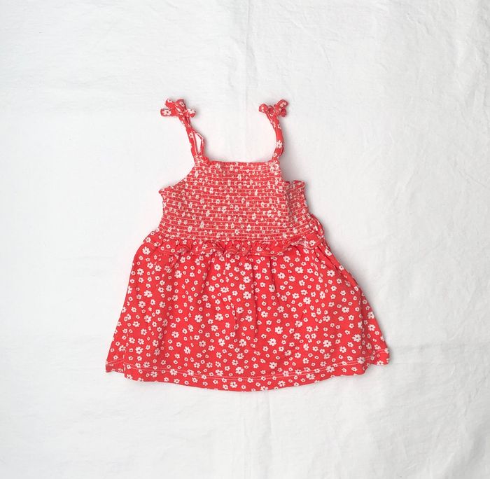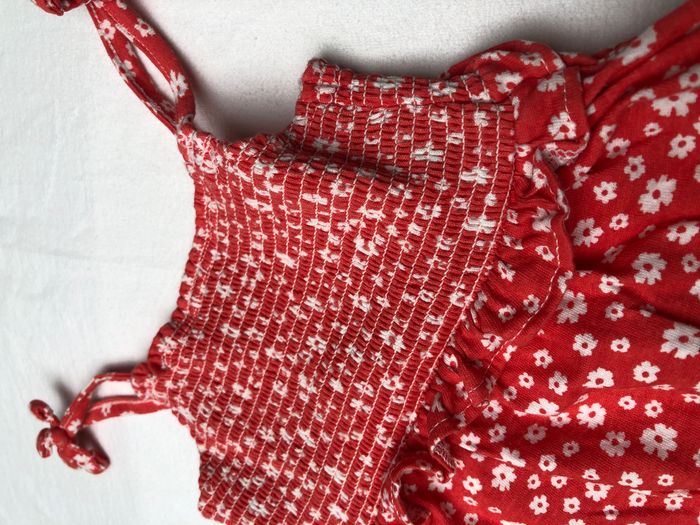Robe été Kiabi, Taille 3 mois/ 60 cm, Sans manches. Très mignonne en coton orange corail/ rouge orangé, motifs petites fleurs blanches, Nœuds sur les bretelles, Volant à la taille, Smocks autour de la poitrine. En excellent état, pas de signe d’utilisation. 🌸 Vous aimez cet article ? N’oubliez pas de visiter le reste de mon dressing en filtrant les tailles.