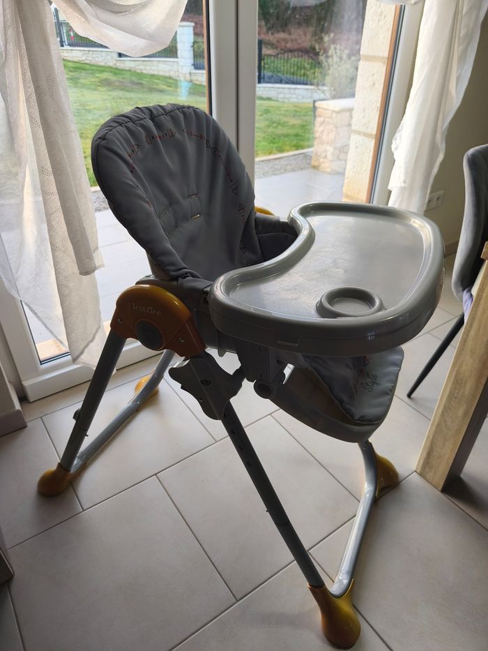 Chaise haute en bois marque combelle  avec coussin et plateau
