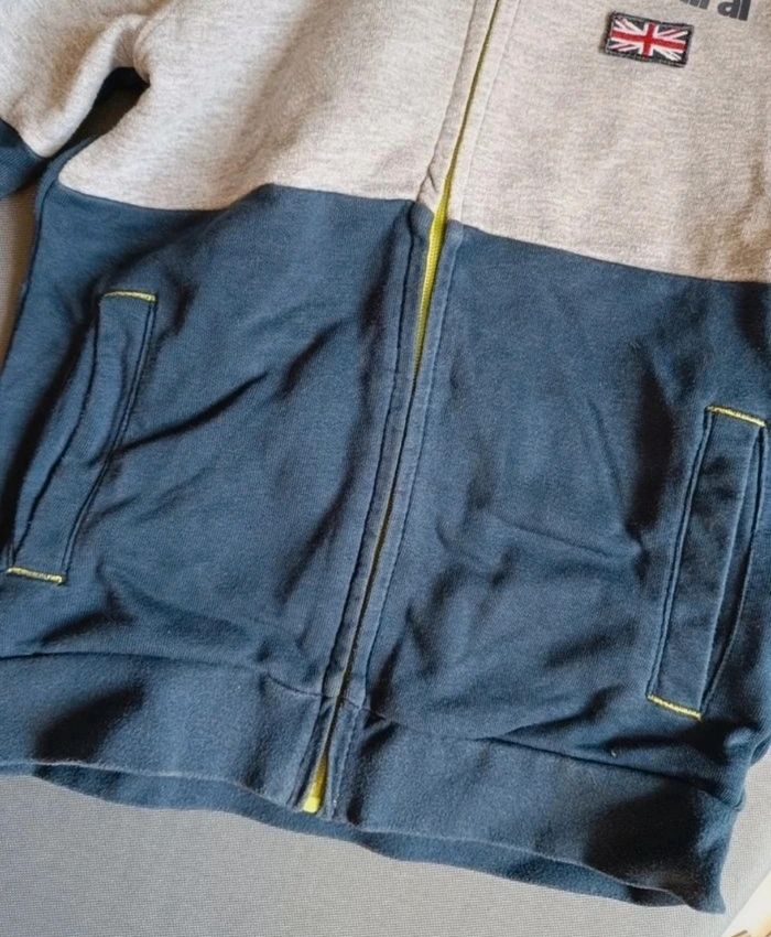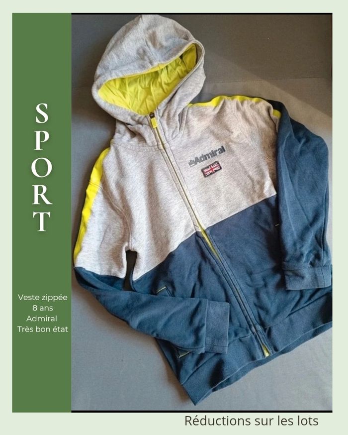 ​✅ L'ESSENTIEL : • Marque : Admiral • Taille : 8 ans • Couleurs : Gris chiné, Bleu marine et Jaune fluo • Design : Look sportif avec logo Admiral et petit drapeau Union Jack sur la poitrine. Intérieur de capuche contrasté jaune. ​🔍 ÉTAT : Très bon état général. À noter : les bandes jaunes sur les manches commencent très légèrement à craqueler (voir photos), mais cela reste discret. ​💡 LE PETIT + : Une veste confortable et stylée, parfaite pour le sport ou les loisirs. ​📦 INFOS : Réductions sur les lots activées ! Envoi rapide et soigné.
