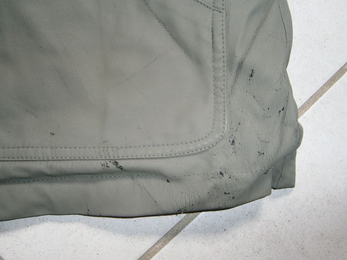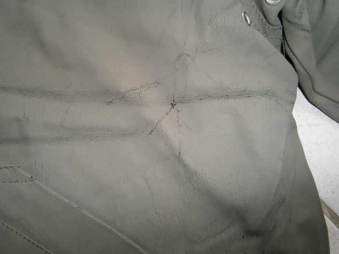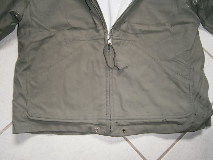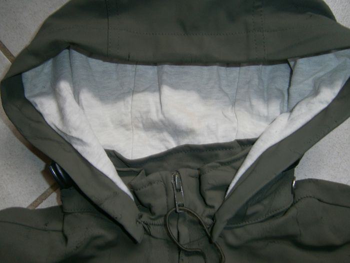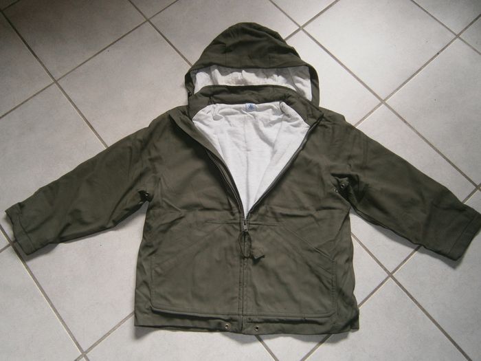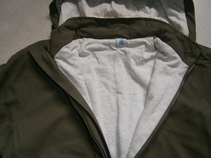 Manteau à capuche détachable et réglable. Couleur kaki, doublé gris clair. Marque PETIT BATEAU. Fermeture éclair devant. 2 poches devant. 2 fermetures éclair au dos pour servir de poche. Tâches sur le tissu intérieur de la capuche (photo). Dessus du manteau usé (photos). Composition : Dessus = 70% polyester, 30% polyuréthane. Doublure = 35% coton, 65% polyester. Taille 10 ans.