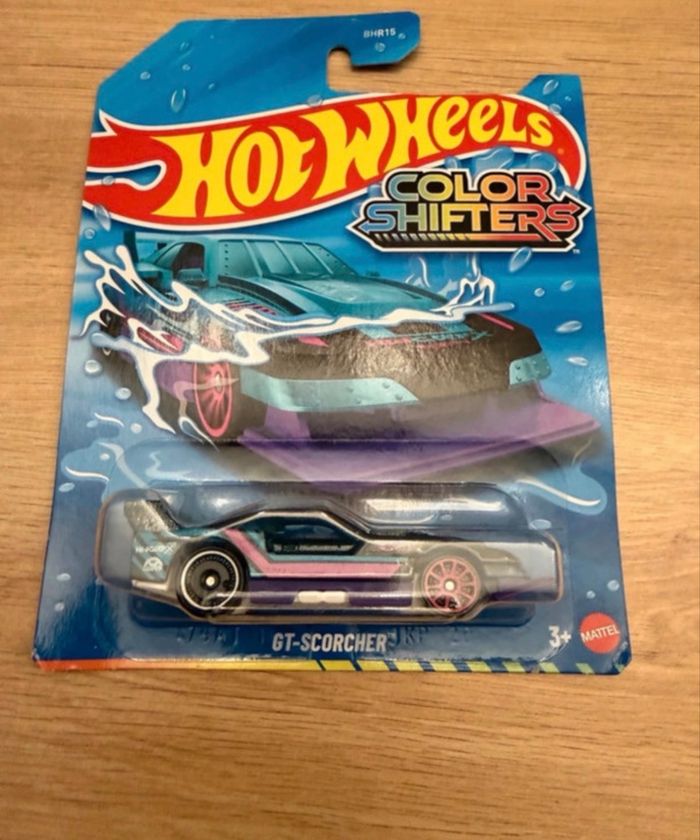 Je vends ce Hot Wheels GT Scorcher de la collection Netflix Let's Race. Un petit véhicule miniature parfait pour les enfants qui aiment les voitures de course ! - Type de produit : Véhicule miniature - Marque : Mattel - Gamme / Licence : Hot Wheels - Netflix Let's Race - Modèle : GT Scorcher - Fonctionnalités : Color Shifters (changement de couleur) - Accessoires inclus : Boîte d'origine