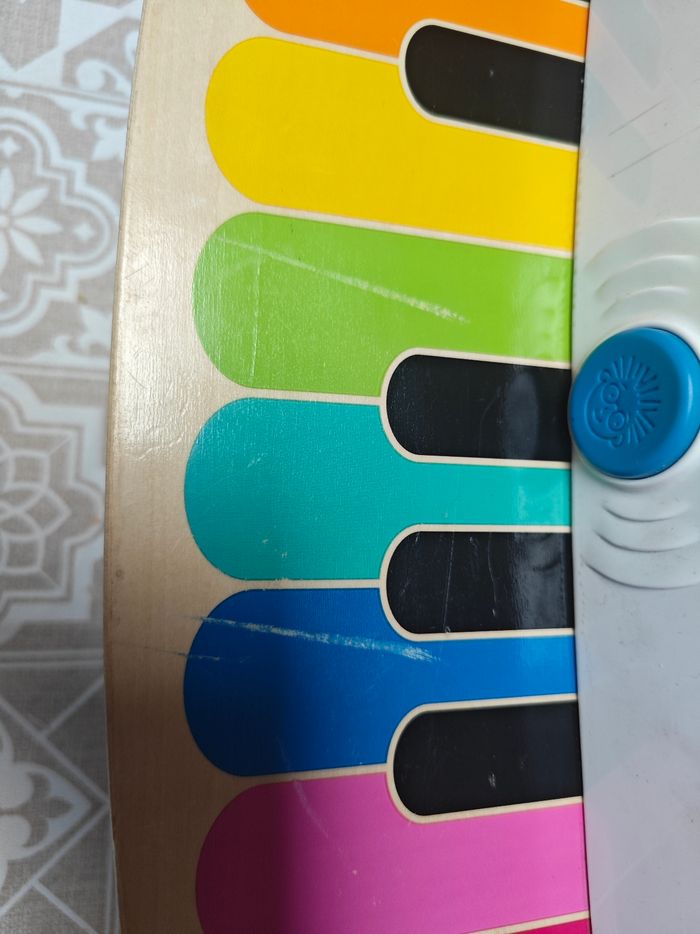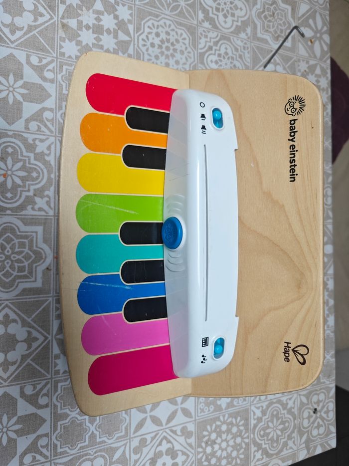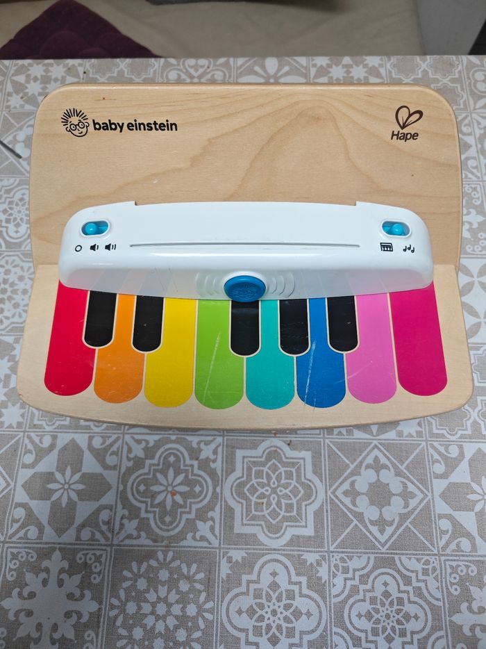 Piano Magic Touch. Devenir virtuose n'aura jamais été aussi simple avec ce piano pour bébé Baby Einstein ! En plus de produire des sons dignes d'un vrai piano, votre petit artiste n'a pas besoin de presser des boutons pour jouer, simplement d'effleurer les larges touches en bois ! Il débute ? Un premier mode lui propose d'entendre le piano jouer seul pour éveiller sa sensibilité musicale. Son ascension débute lorsqu'il glisse une des partitions dans le pupitre pour jouer facilement des chansons grâce à un code couleurs. Plus tard, il pourra même composer ses propres mélodies. Stables grâce à ses pieds robustes, ce piano pour bébé en bois apporte un vrai confort de jeu qui met en confiance votre bébé pour qu'il révèle son talent artistique à l'ouïe de tous ! Toujours soucieux de vos oreilles, le son de ce piano pour bébé se règle de fort à doux. Les plus produit : Stimulant : sons de piano très réalistes Pratique : doté d'un clavier électronique interactif Educatif : développe motricité et sensibilité musicale Caractéristiques : Ce piano pour bébé est en bois et en plastique Utilisation : de 1 an à 3 ans Dimensions : L30,50 x l18 x H18 cm 3 cartes recto-verso de partitions Fonctionne avec 3 piles AA LR6 Défauts visibles sur les photos