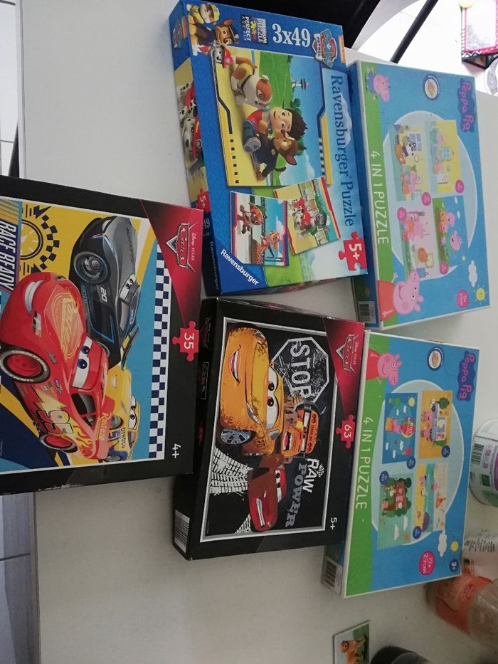 12 puzzles au total. 2 peppa pig, 1 pat patrouille et 2 cars. 3,4 et 5 ans