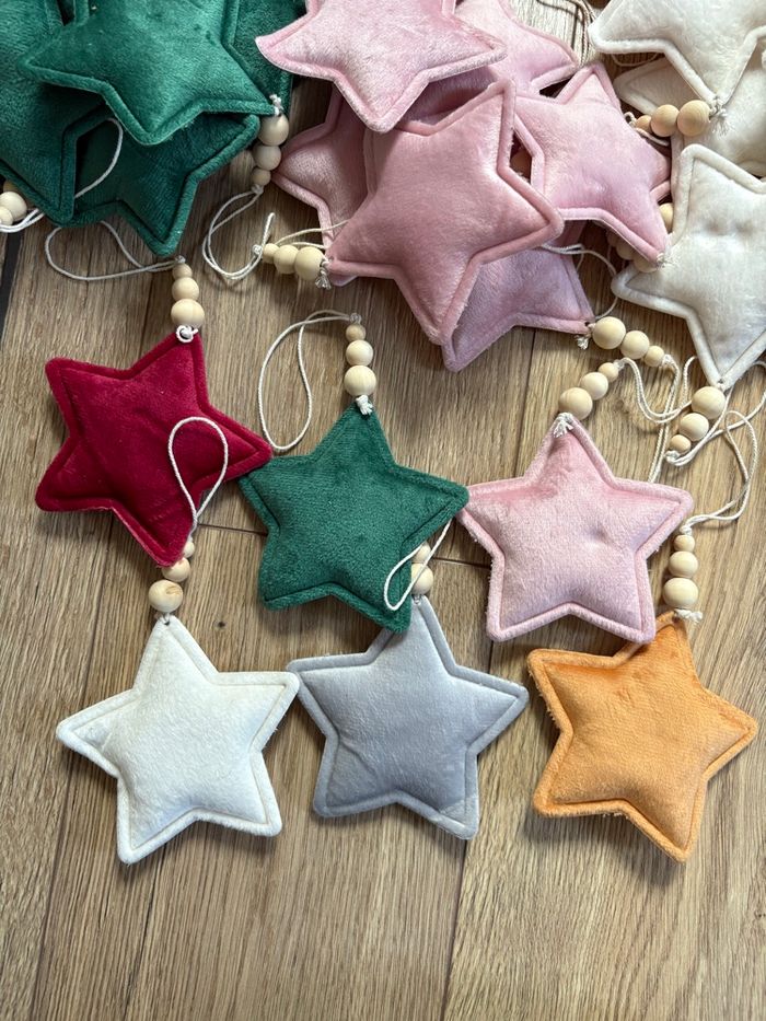 Étoiles en velours à suspendre avec déco bois. Pour Noël ou en déco. Idéales pour du flocage avec prénom. En lot ou à l’unité (1,50€ l’unité ou le lot complet à 88,50€) Il y a : -20 Bordeaux -10 beiges -8 grises -9 vert foncés -7 roses -5 dorées Soit 59 étoiles au total Merci de ne pas acheter l’annonce et de m’envoyer un message pour créer votre lot ou prendre le lot complet