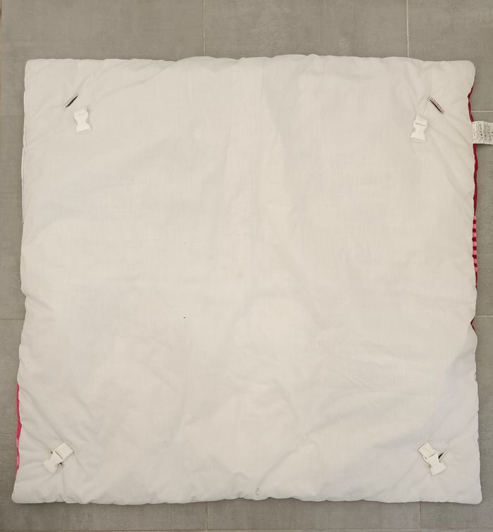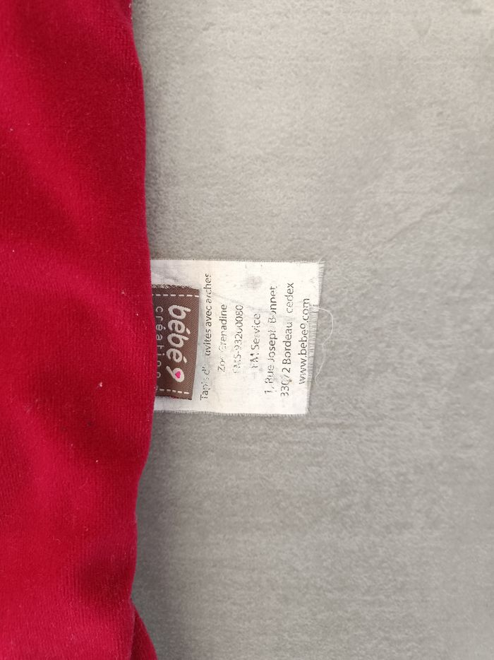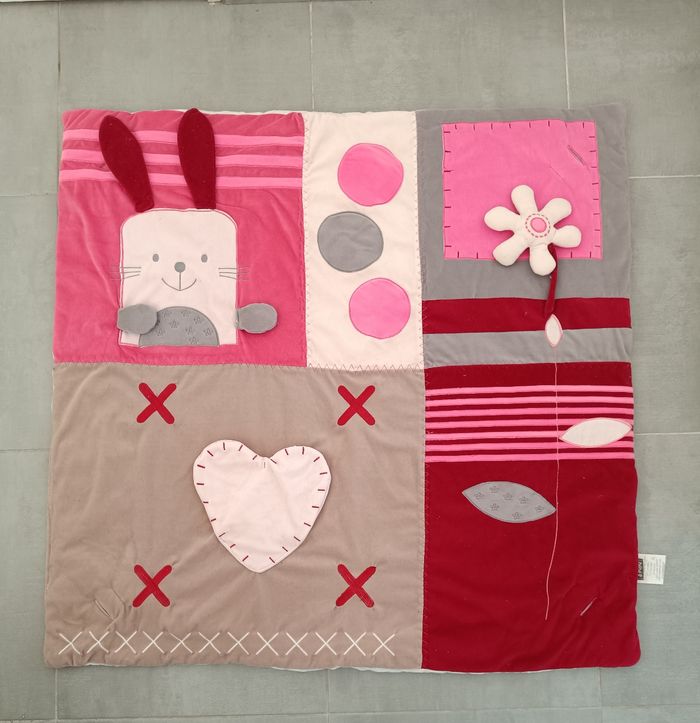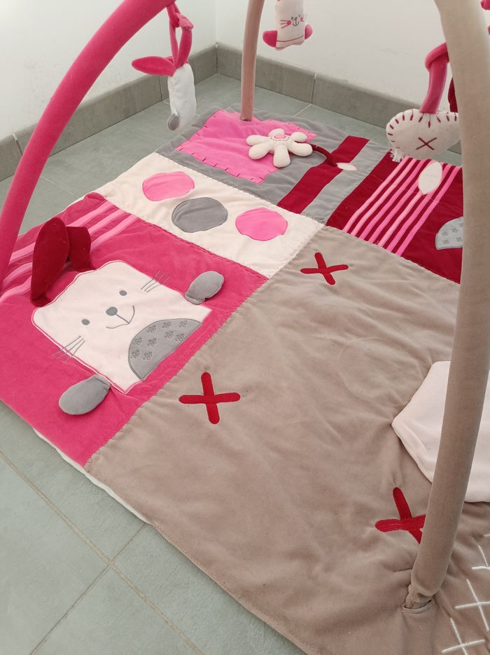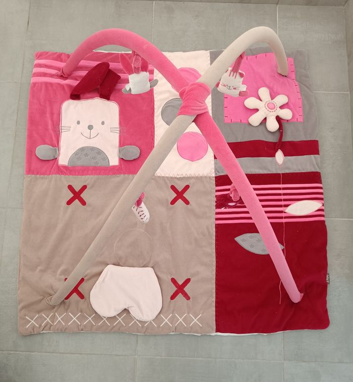 Tapis d'éveil ou de sol en velours. Arche et ses 4 peluches en forme de chat, cœur, lapin et fleur. Collection Zoé Grenadine. Petit jeu : papier crissant, grelot, pouet-pouet, différentes couleurs et textures. Taille : 1 m x 1 m. Marque : Bébé 9. #melody45340puericulture