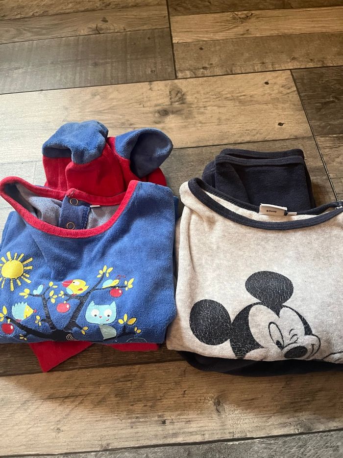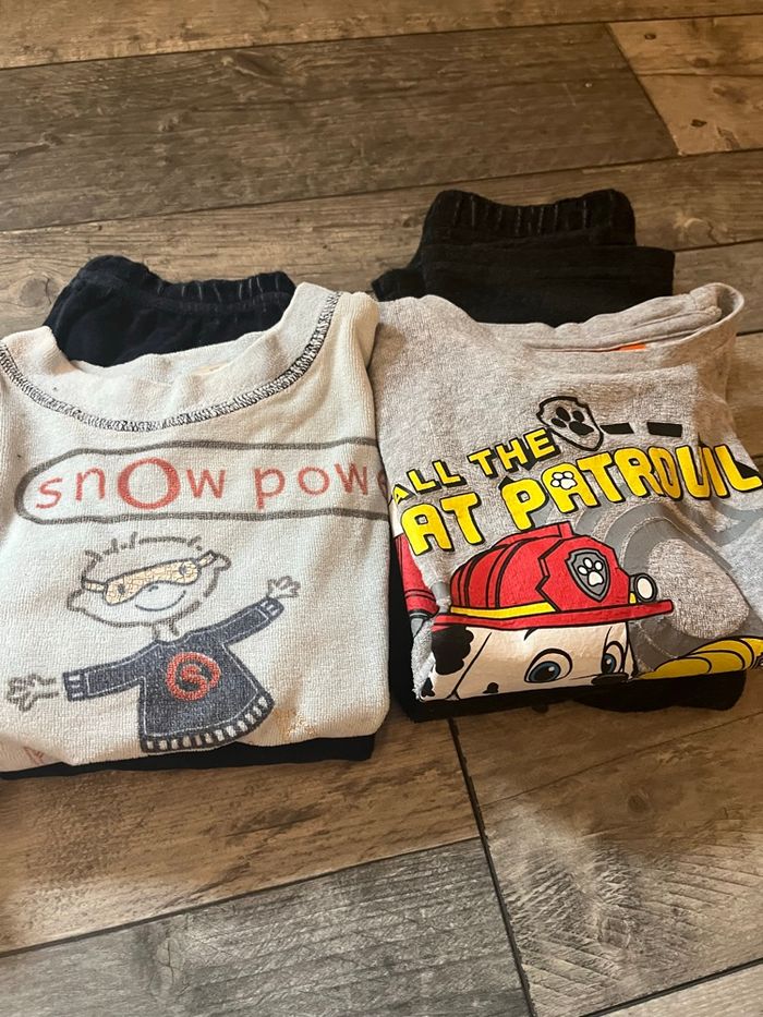 Lot de 4 pyjamas chaud tout doux Ensembles complet haut + bas Mickey / pat patrouille / divers En bon état Le rouge et bleu a les pieds fermer Taille 3 ans