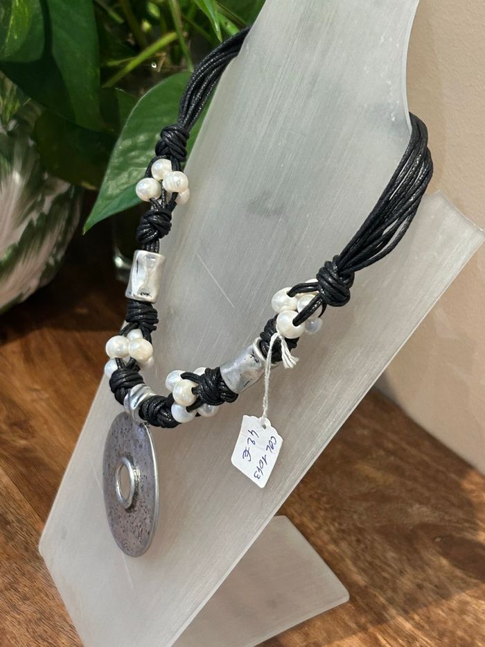 Collier en acier inoxydable 36 cm + chaînette 9 cm Cuir perle naturelle et anneau acier martelé
