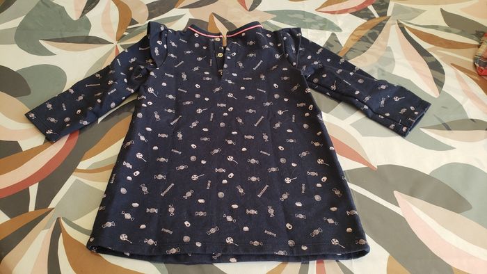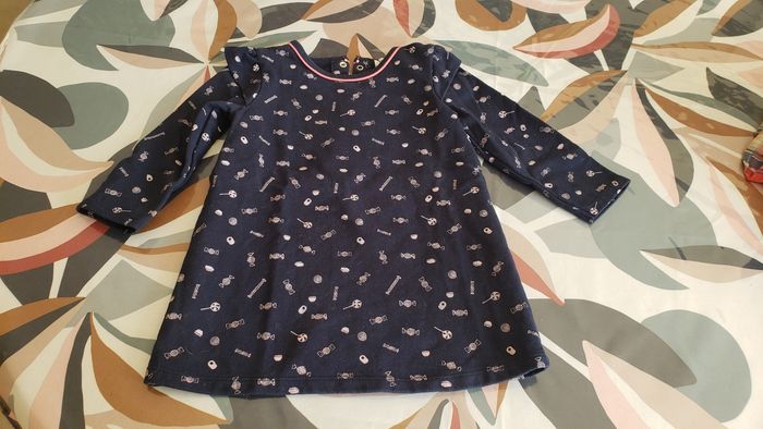 En très bon état Bleu marine avec des bonbons en dessin. Se ferme dans le dos avec des boutons pressions.