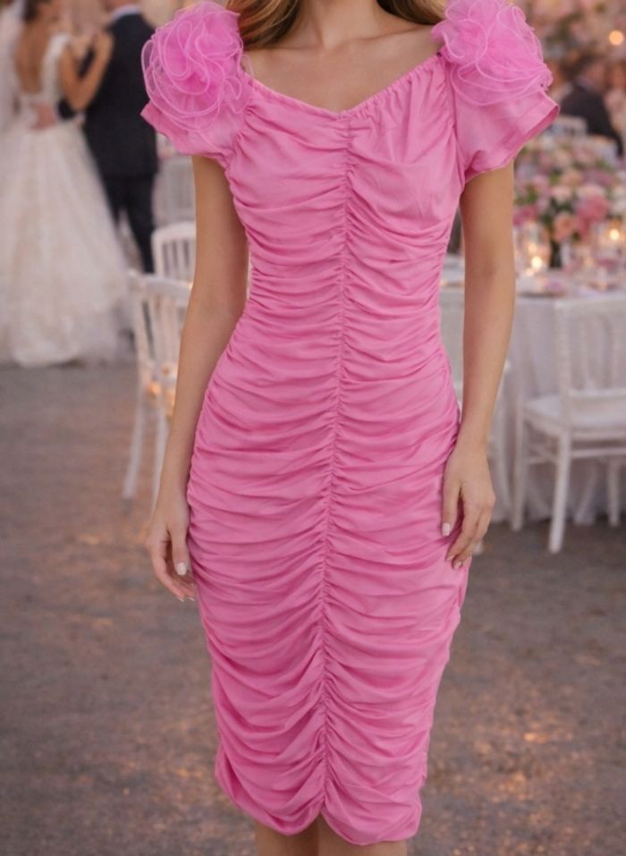 Robe fleur rose ref cart27, en polyester élasthanne, doublée, manches courtes avec fleur de chaque coté. (Elles peuvent s'enlever facilement). Smockée sur les cotés. Milieu du dos jusqu'en bas : 74 cm, neuve, arrière identique à l'avant