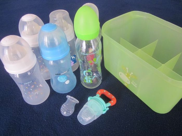 6 biberons différentes contenances + tétine d'alimentation avec rechange (permet l'ingestion de médicaments liquides ou compotes ou jus ...) + range biberons