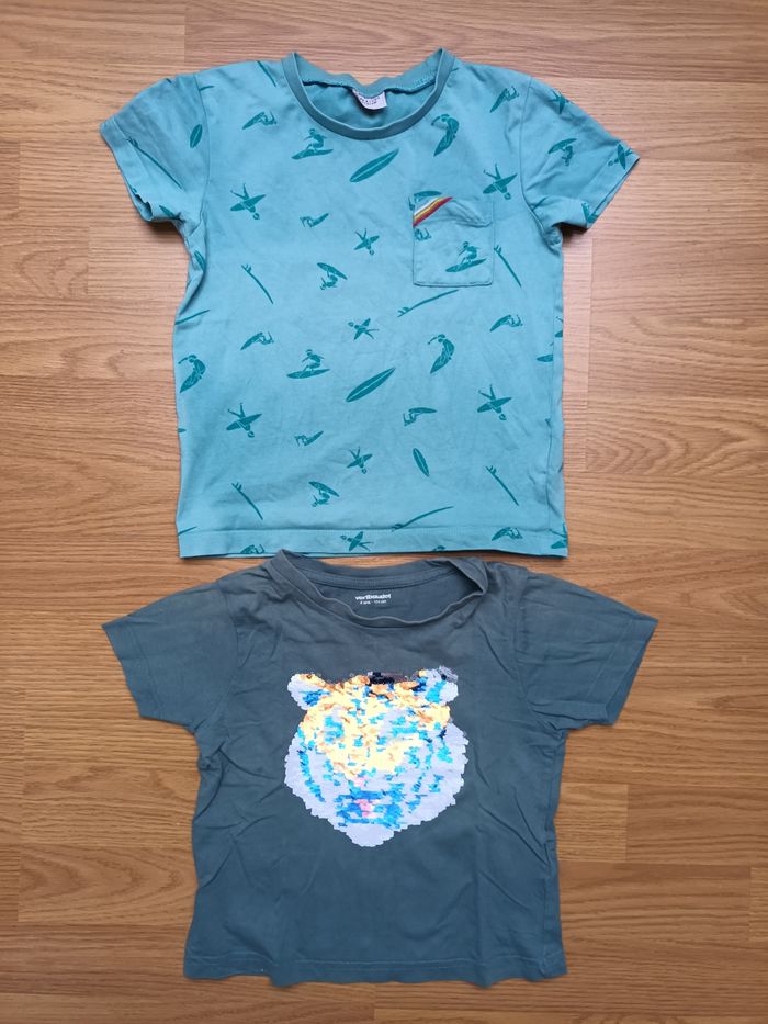 Lot de 2 tee-shirts manches courtes taille 4 ans Marque Vertbaudet avec tigre en sequins Marque TAO pour le turquoise Portés en très bon état sauf quelques petites taches sur le turquoise