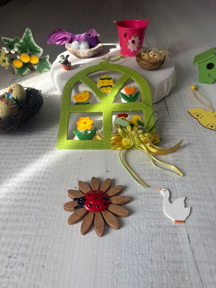 Lot décoration de Pâques - 1 fenêtre avec poussins-poule et fleurs - 1 nid avec 3 œufs peints Diamètre 11 cm - 1 nid avec oieau mauve et œufs argenté Diamètre 6 cm - 1 nid avec 2 poussins Diamètre 5 cm - 1 niche oiseaux verte - 1 oiseau jaune en bois petit pet en bas d'un côté - 1 fleur en bois - 1 coccinelle en métal - 1 bouquet avec œufs jaunes et fleur - 1 petit oie blanche en bois -1 petite poule dans son œufs Neuf Sauf le petit sceau rose coccinelles qui a de la peinture un peu abîmé à certains endroits et l'oiseau jaune abîmé sur le bas * Prix non négociable ⚠️ Envoi uniquement par Mondial Relay et Colissimo