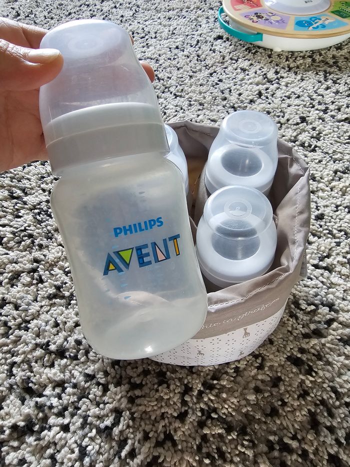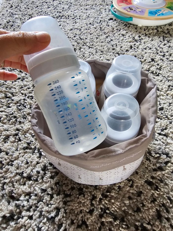 Biberons avec poche de rangement Biberons en bon état en plastique 260ml Poche de rangement neuf Plusieurs vêtements garçons et femmes dans mon dressing promo en lot 😀 Envoi rapide et soigné 😉