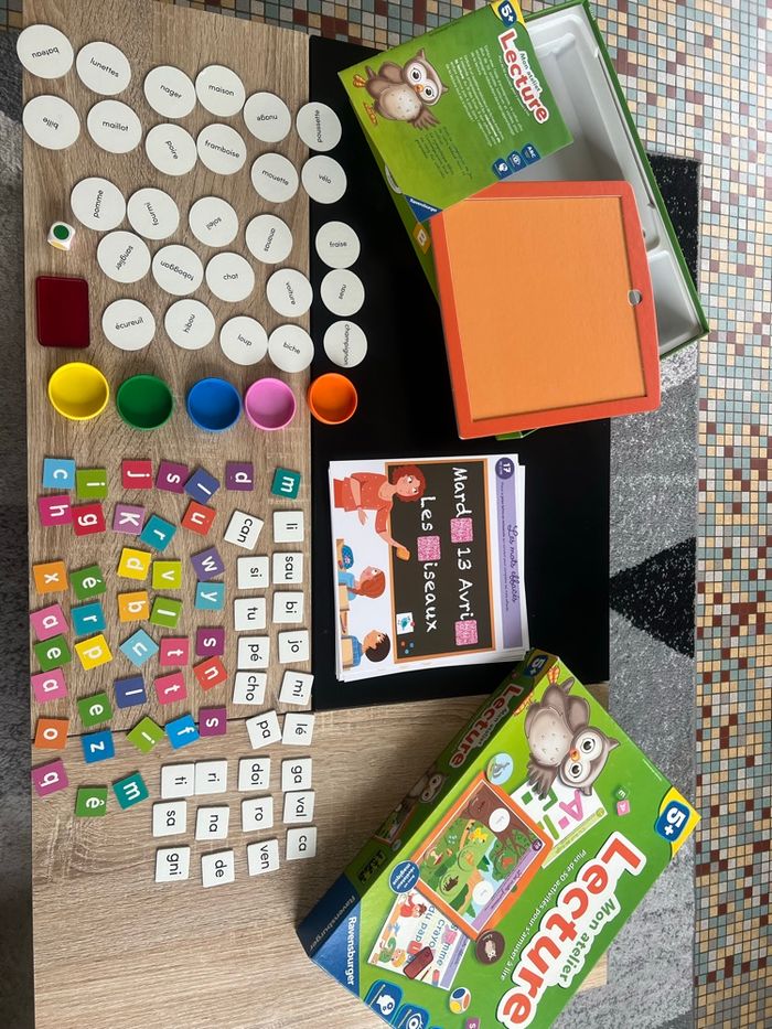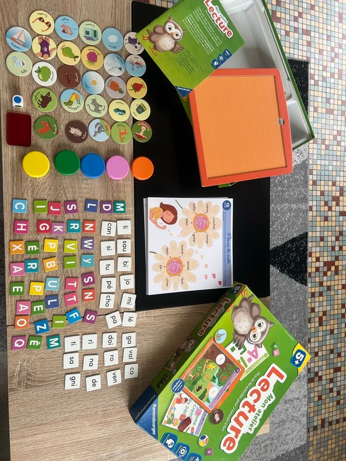Contenu: 1 cadre support, 24 fiches recto-verso, 6 fiches avec lettres, 1 dé, 5 caches colorés, 1 révélateur, 40 jetons lettres, 24 jetons syllabes, 27 jetons mots, 1 notice Le jeu est complet et en très bon état – Découverte de l’alphabet, des sons et des rimes – Reconnaissance des différentes graphies – Premières lectures – Le + produit : Un système d’autocorrection magique grâce à un révélateur !