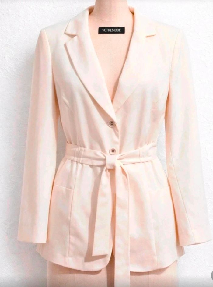 🤍 Blazer écru VOTRE MODE ceinturé – Taille 52 chic Élégant blazer VOTRE MODE coloris écru / beige clair 🤍 Une pièce chic et structurée, parfaite pour le bureau ou une occasion. ✨ Coupe flatteuse avec ceinture à nouer pour marquer la taille ✨ Style élégant et intemporel ✨ Facile à porter avec pantalon, jean ou robe 📏 Détails Marque : VOTRE MODE Taille : 52 Matière : polyester Fermeture : 2 boutons Ceinture amovible Deux poches avant 📐 Mesures : Aisselle à aisselle : 65 cm Longueur : 68 cm 🧼 État : bon état