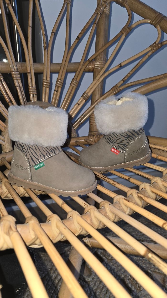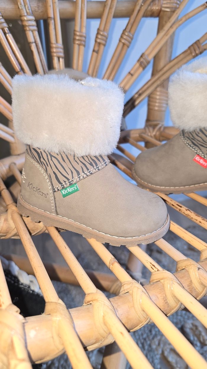 Bottines Kickers marron en cuir avec imprimé animal, fourrure beige sur le haut, fermeture sur le côté, taille 20, neuve Acheté 79€ #kickers #lot