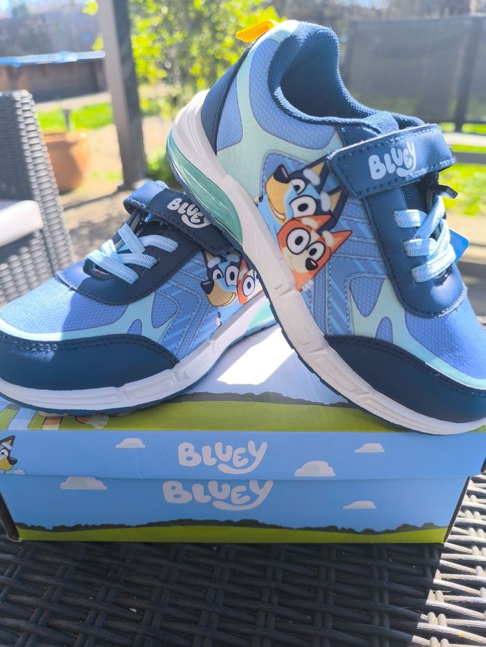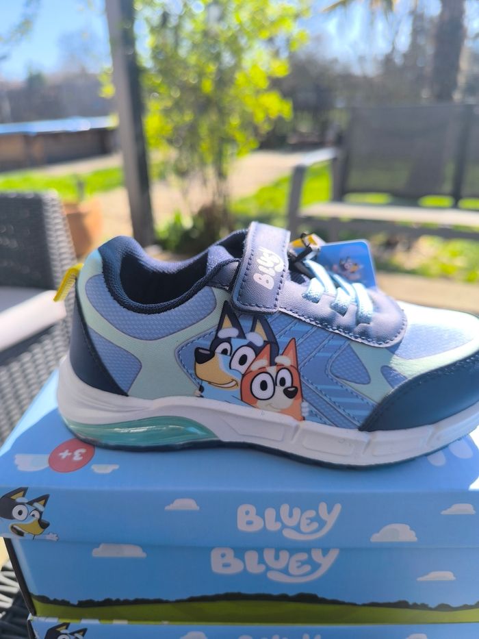 Superbes baskets à l'effigie de Bluey et Bingo. ​Couleurs : Bleu ciel et bleu marine avec détails jaunes. ​Pratique : Fermeture par scratch (velcro) sur le dessus + lacets élastiques pour que l'enfant soit autonome