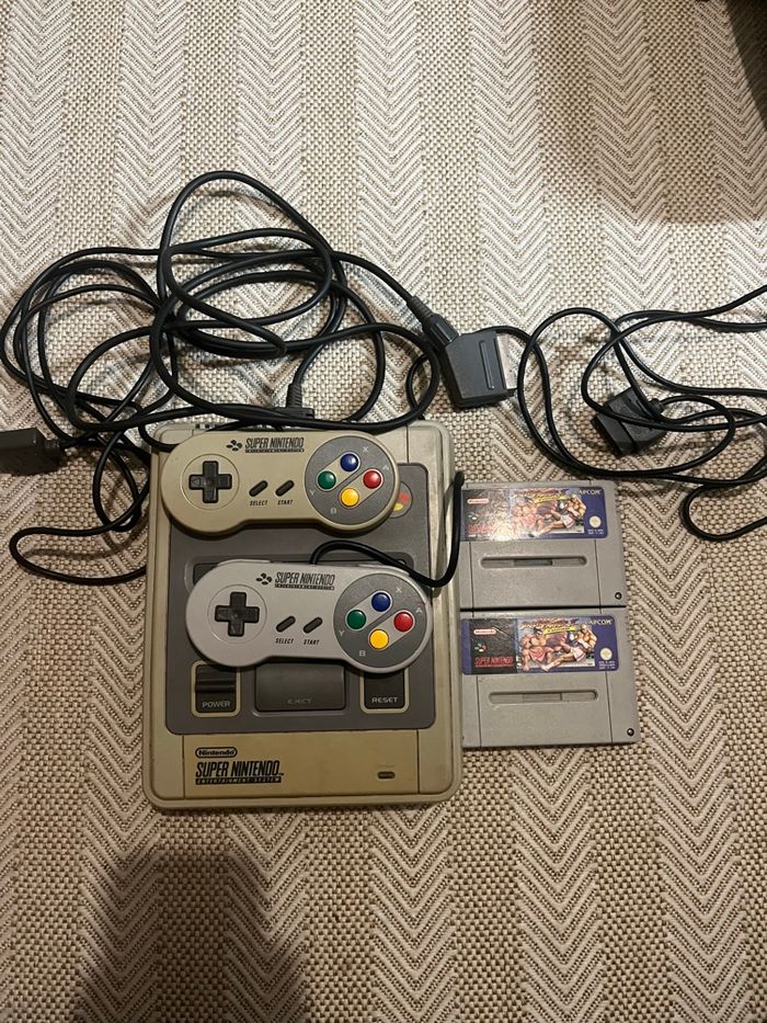 Je vends cette console Super Nintendo SNES grise avec tous ses accessoires d'origine. Un véritable classique pour les amateurs de rétro gaming ! - Type de produit : Console de salon rétro - Marque : Nintendo - Modèle : Super Nintendo SNES - Couleur : Gris - Accessoires inclus : 2 manettes officielles SNES, Câbles d'alimentation et vidéo, 2 jeux cartouches (Street Fighter II et un second titre) Très bon état N'hésitez pas à me contacter pour plus d'informations ou de photos ! Les jeux ne sont pas vendus avec
