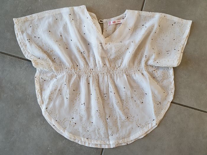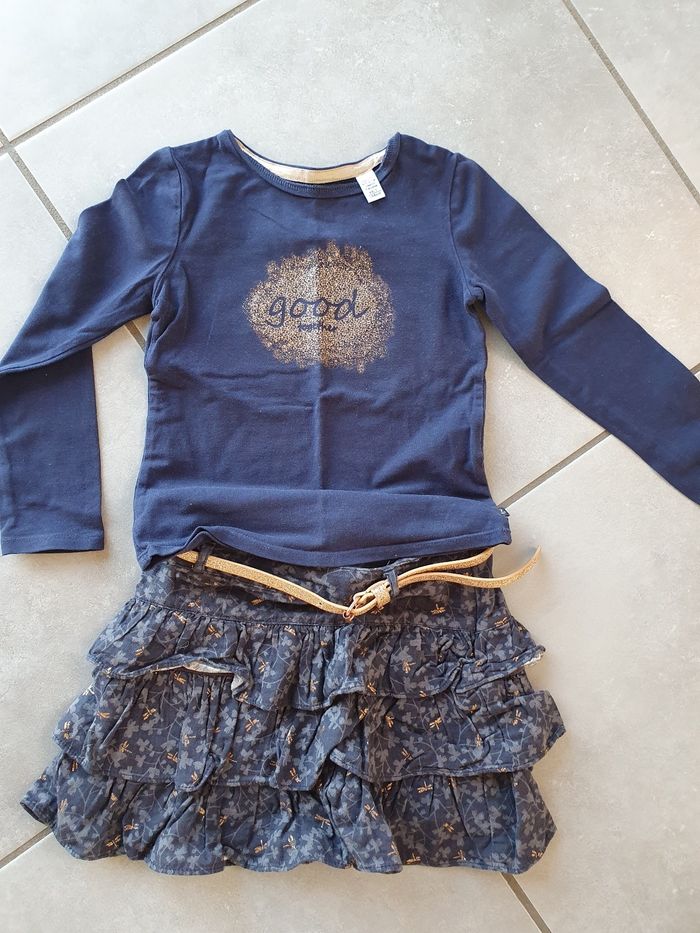 Comprend 1 chemisier gemo 1 robe lulu castagnette 1 ensemble t-shirt manches longues et jupe okaidi Très bon état sauf robe lulu qui bouloche cf photo