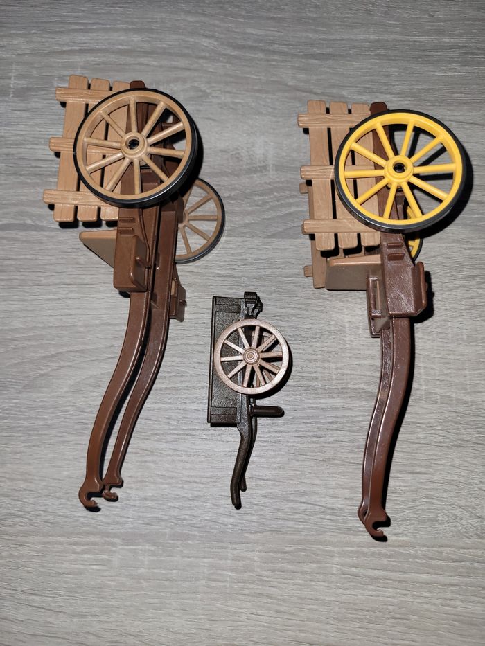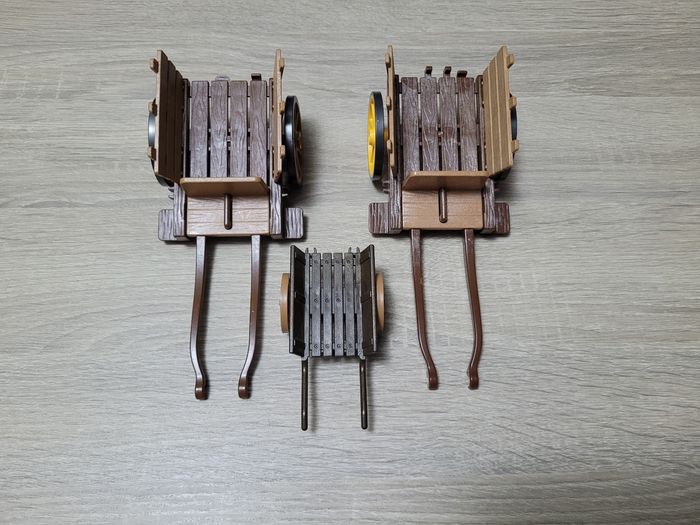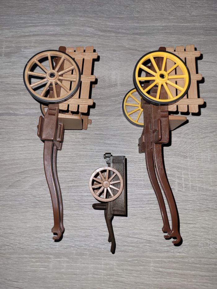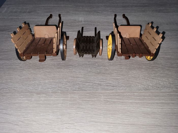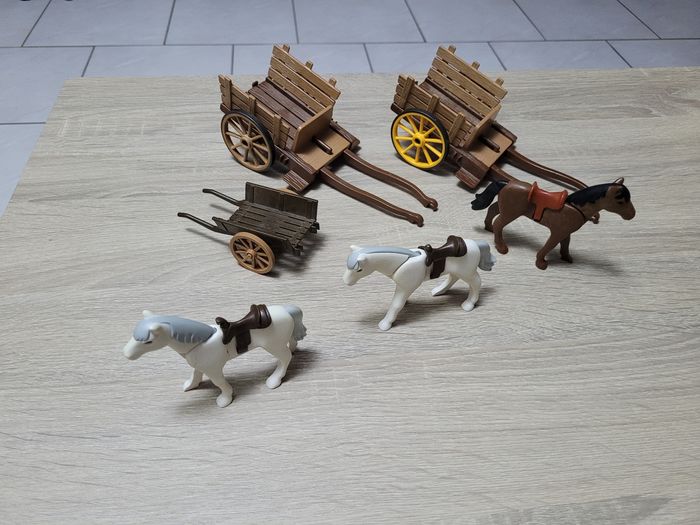 Vend lot de playmobils en bon état juste des signes d'usures liés au jeu (voir photos). Lot comprenant 3 chevaux avec 3 charrettes dont 2 grandes et une petite. Vendu tel que sur la publication.