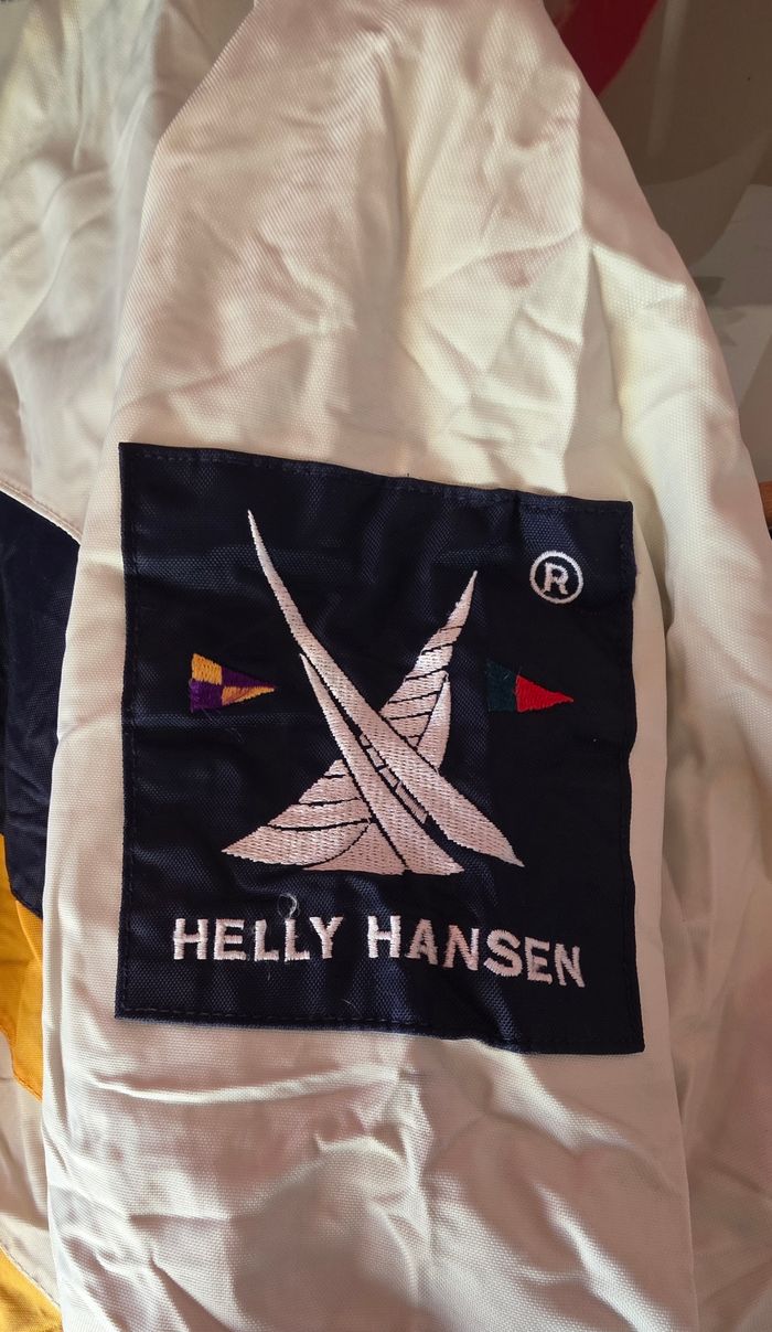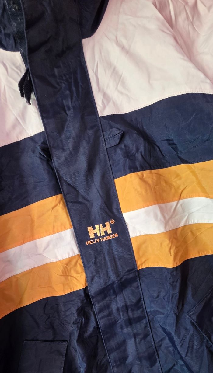 Description : Vends authentique veste Helly Hansen de la gamme "Equipe", une pièce iconique des années 90 en Taille XS. Difficile à trouver dans cette petite taille ! ​Design colorblock marine/crème avec le célèbre col en polaire jaune. Parfaite pour un look retro-sportswear ou urbain. ​Marque : Helly Hansen (Gamme Equipe) ​Taille : XS (taille normalement, peut convenir à un S ajusté) ​État : Très bon état vintage (voir photos pour les détails) ​Style : Fermeture zip + pressions, logo central brodé, patch manche gauche, serrage poignets velcro. ​📏 Mesures (sur demande) : N'hésitez pas si vous voulez la longueur des bras ou la largeur d'épaules !