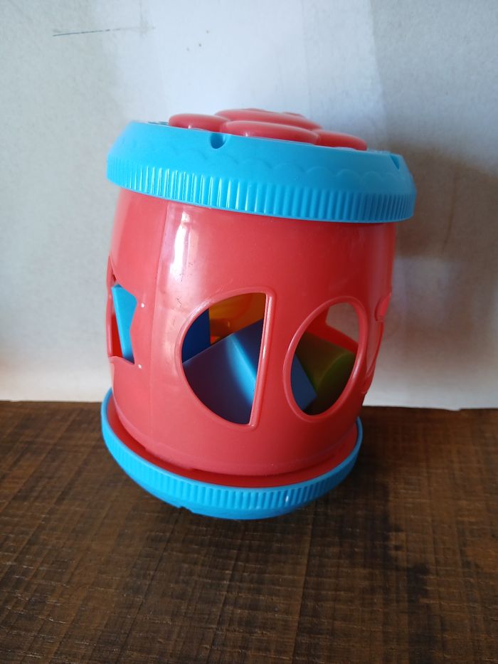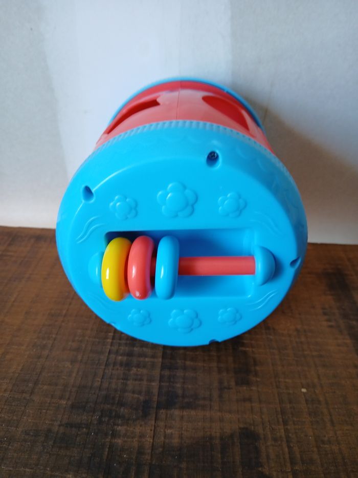 Jeu d'éveil pour remettre les formes au bon endroit. La porte pour ouvrir. Fleur qui fait pouet pouet quand on appuie dessus. Les anneaux de l'autre côté bouge. Complet