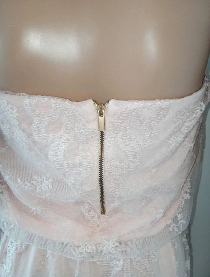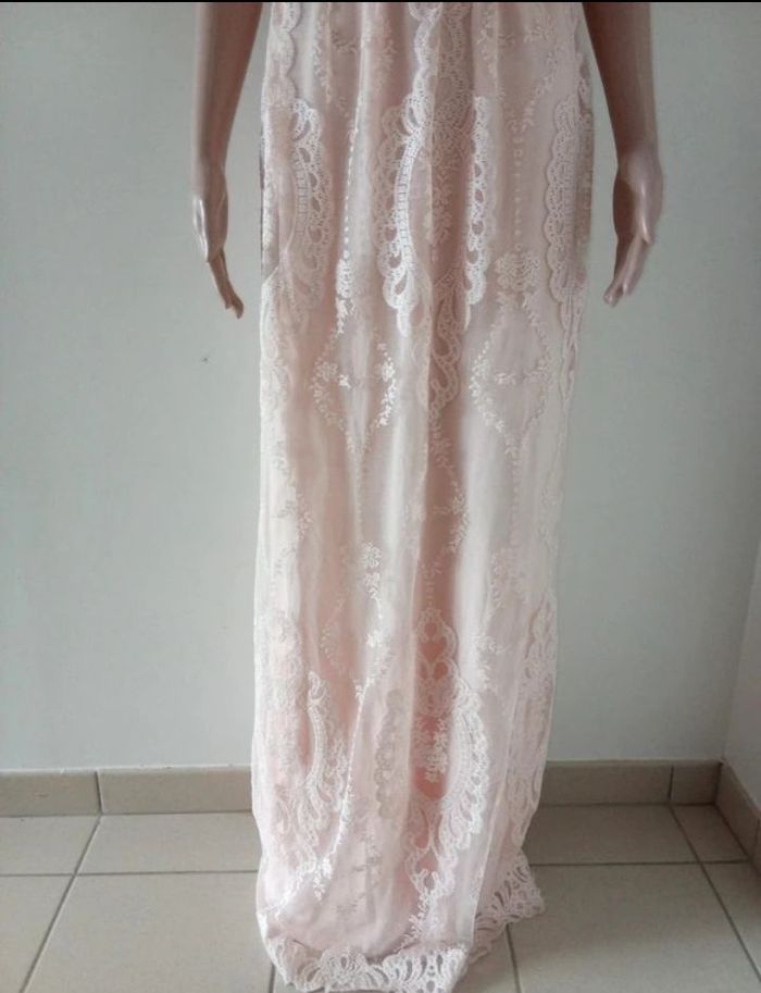 En très bon état sans trous ni tâches, Robe longue, sans bretelles, motifs en imitation dentelle Élastique à la poitrine, fermeture éclair dans le dos Dimensions : Épaules à épaules : pas de coutures Aisselles à aisselles : 39cm Longueur totale : 143cm