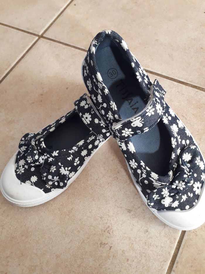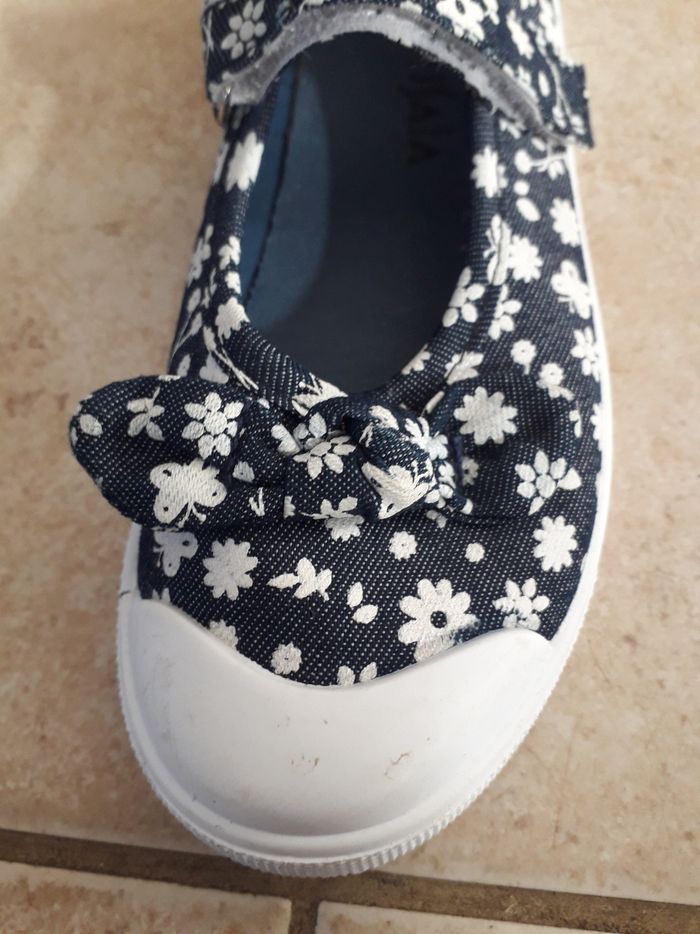 Ballerines couleur jeans foncé avec motif fleuri et papillon. Peu porté. Quelques trace sur la gomme blanche voir photo