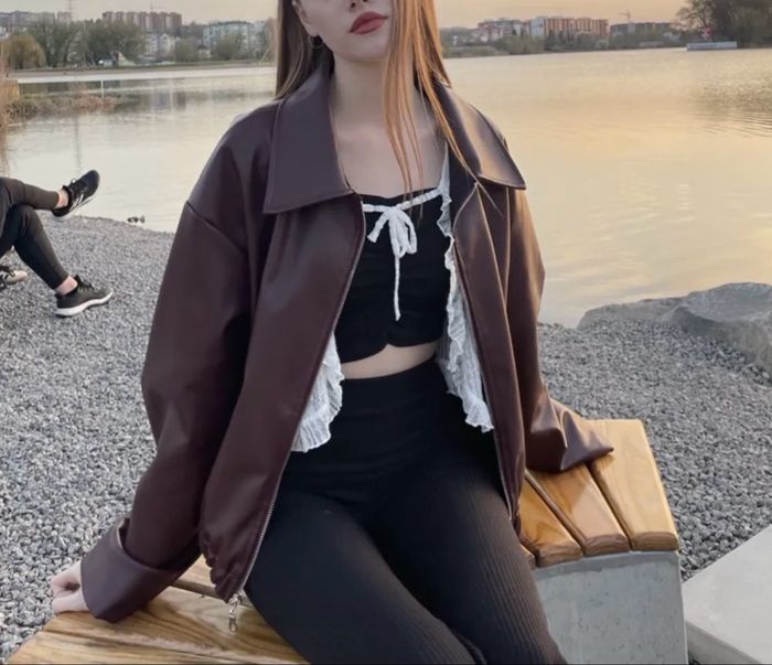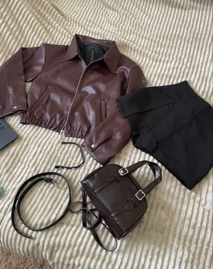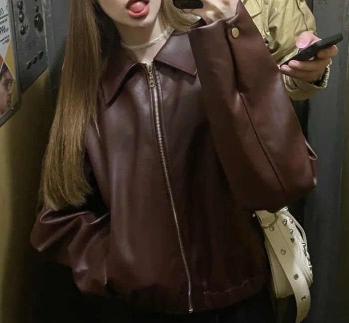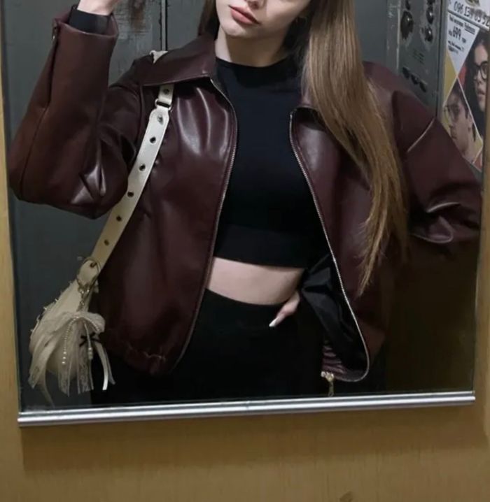 Petite veste — similicuir lisse bordeaux, entièrement doublée, avec une coupe ajustée à la taille et des manches oversize pour un effet un peu rock.