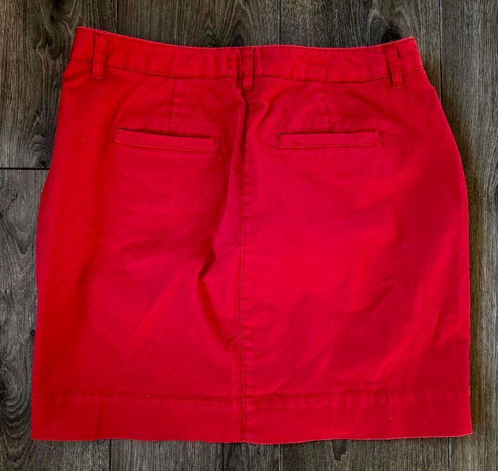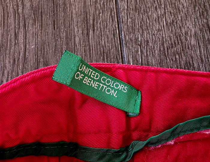 Jupe courte rouge de la marque United Colors of Benetton, coupe droite avec poches sur les côtés.