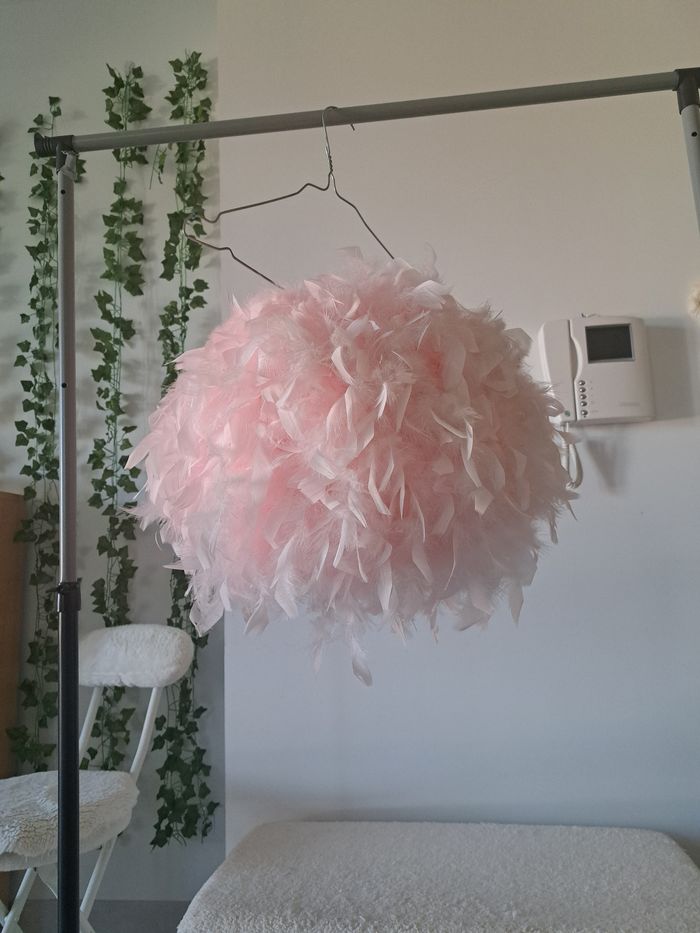 Vend un lustre boule en plumes rose.