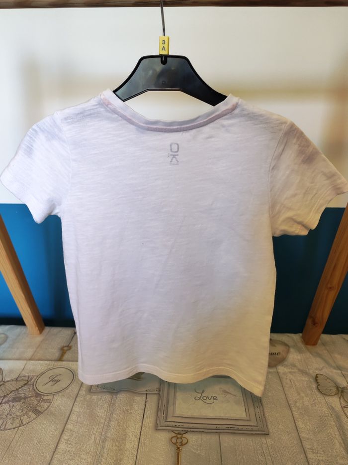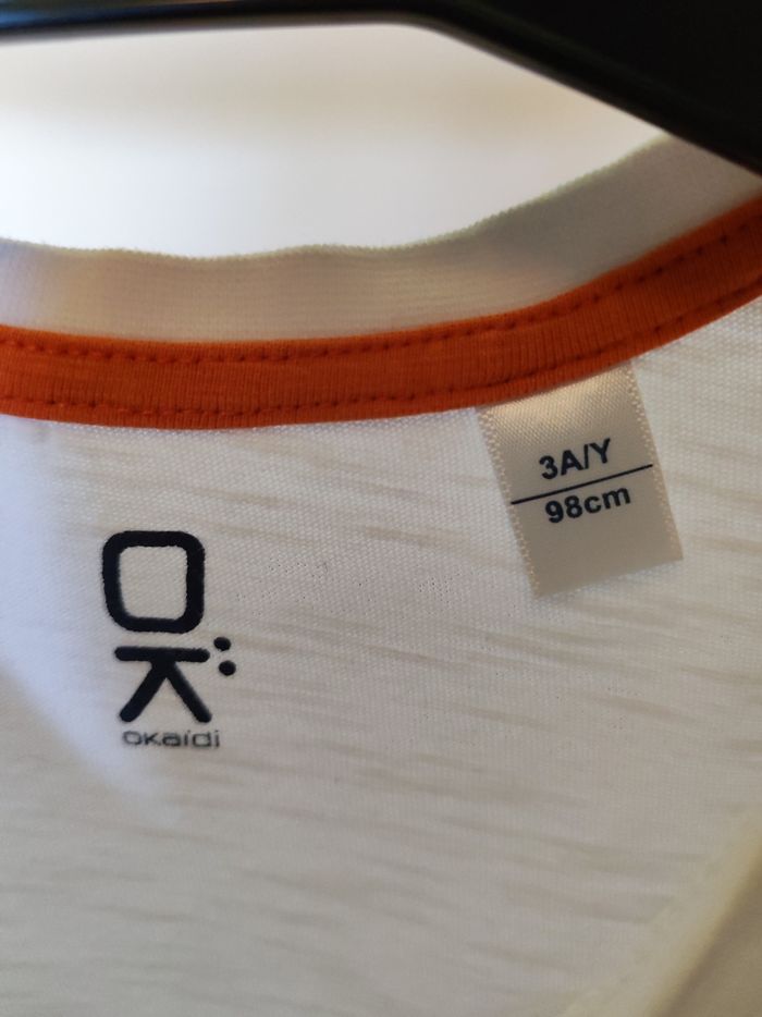 Tee-shirt en taille 3 ans, de marque Okaïdi, de couleur blanc et dessin orangé, en très bon état