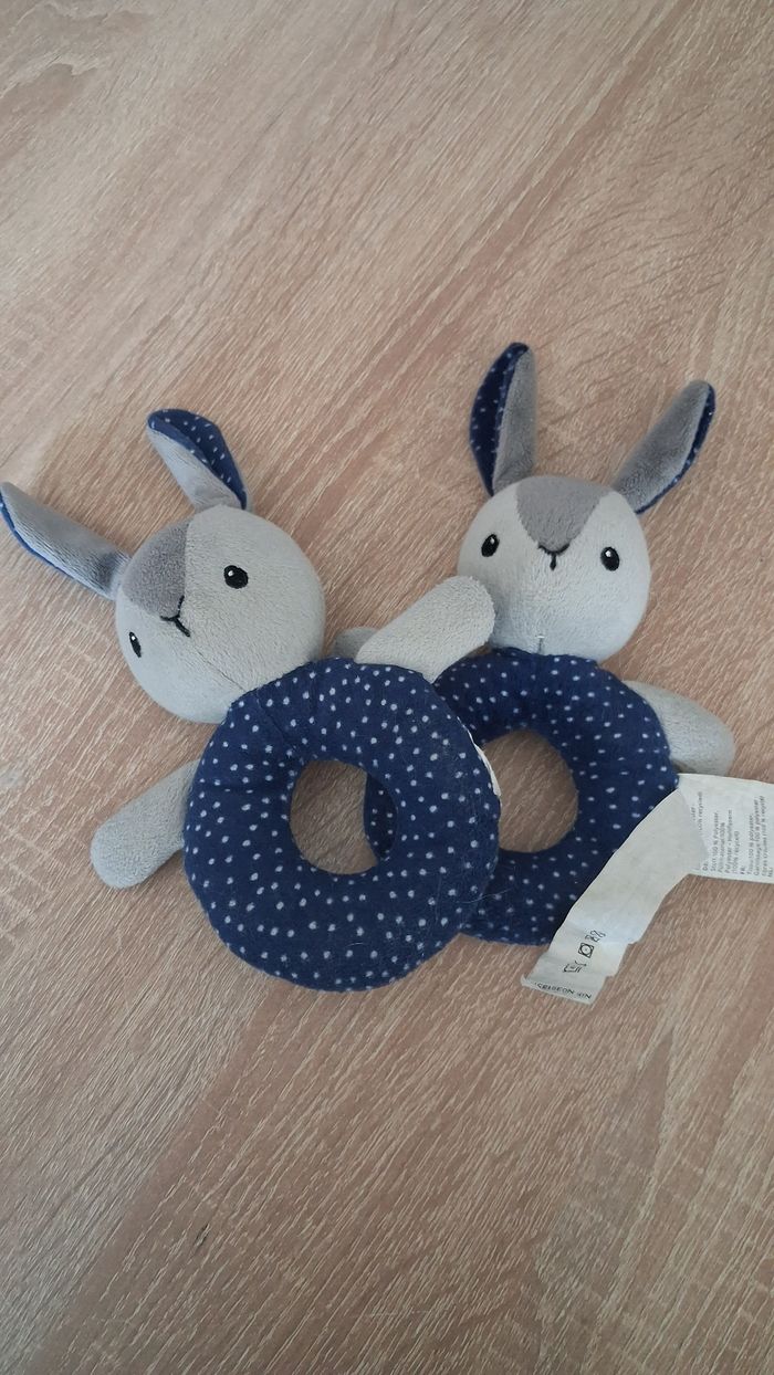 2 hochets peluches lapins Ikea. Un avec l'étiquette coupée.