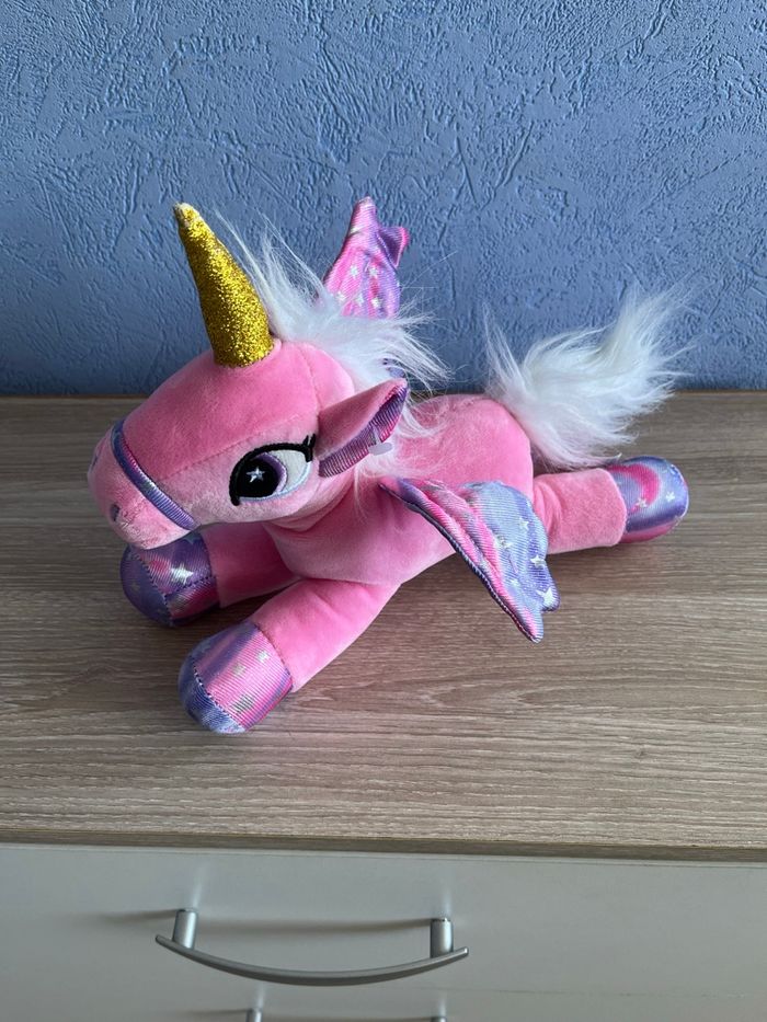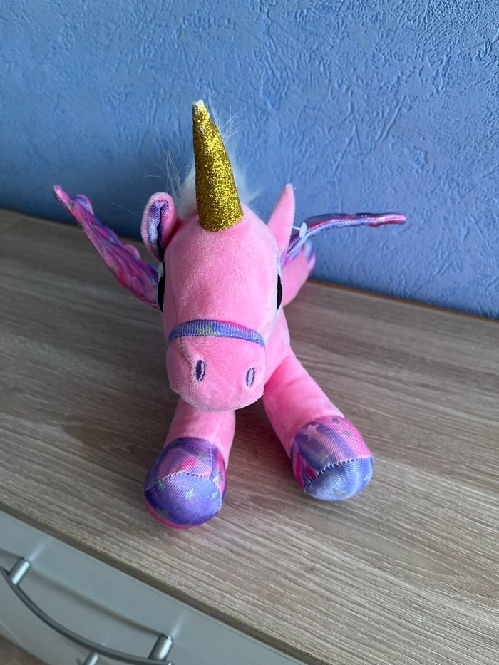 Peluche licorne rose. Dimensions 29 cm par 22 cm. Très bon état