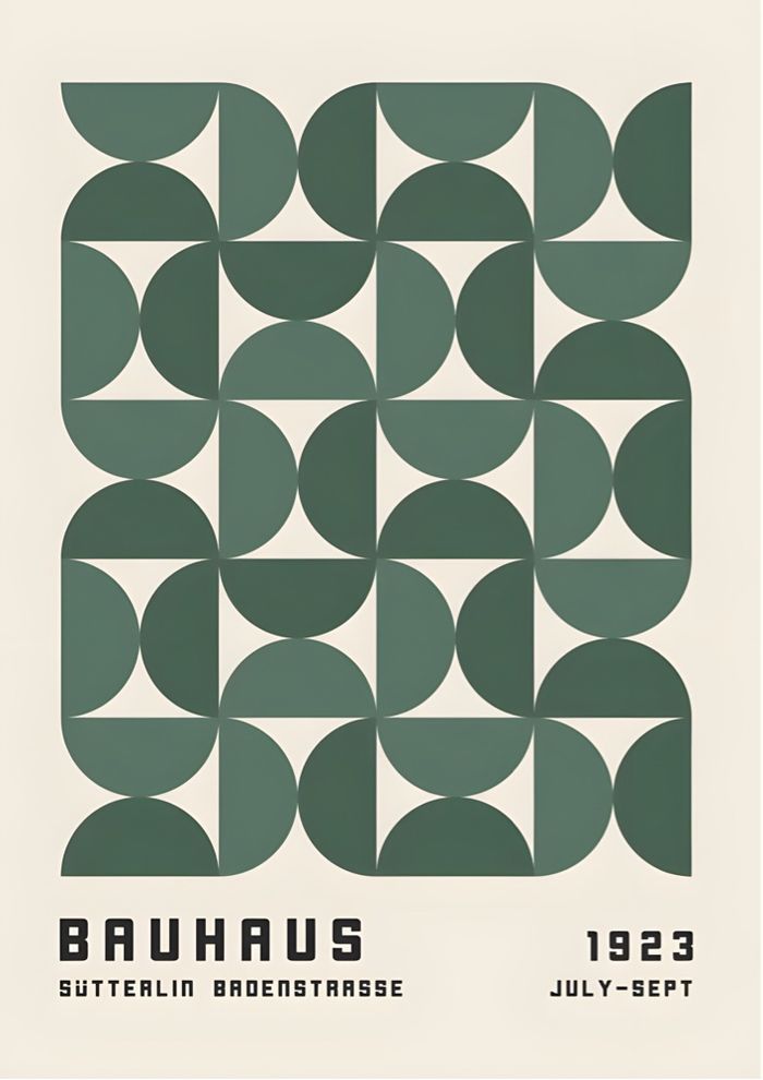 🖼️ Affiche d’exposition Bauhaus, datée de 1923 – Composition géométrique en grille, alternant formes abstraites vert foncé et blanc – Motifs répétitifs et symétriques typiques du mouvement Bauhaus, jouant sur la fonctionnalité, la structure et la pureté des formes – Typographies sobres évoquant les expositions historiques de l’école d’art et de design – Illustration parfaite pour une décoration murale moderne, architecturale et minimaliste.