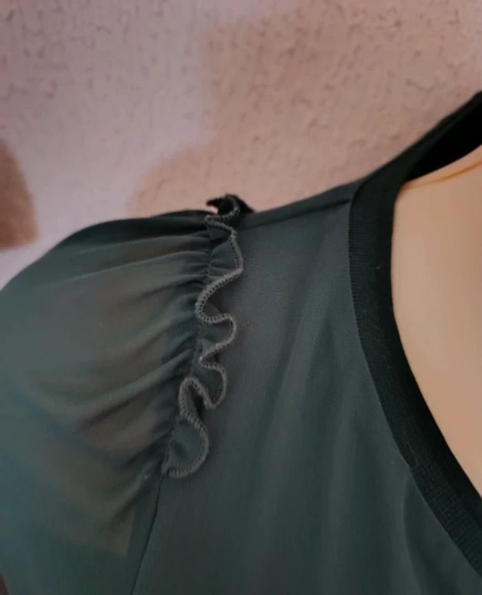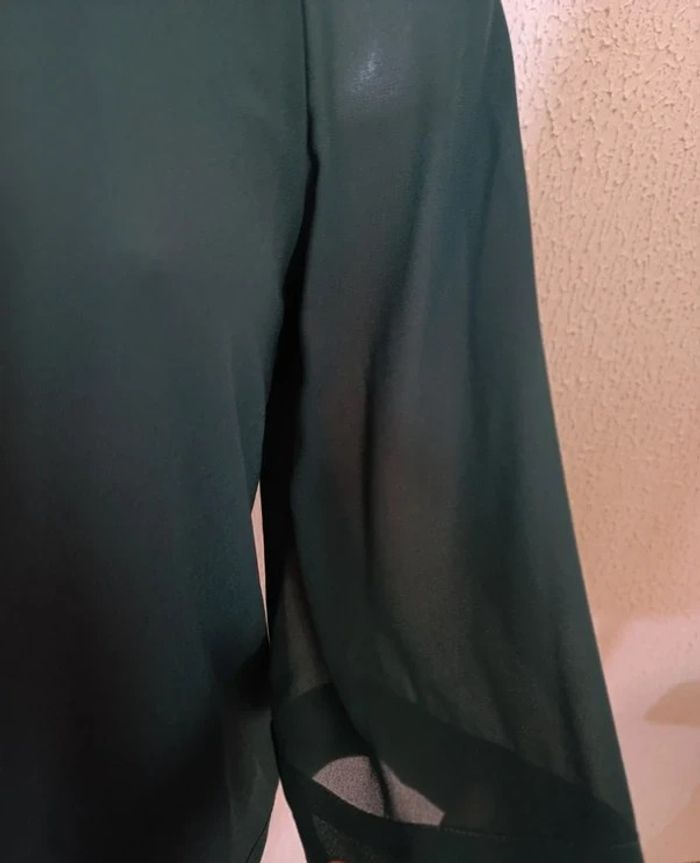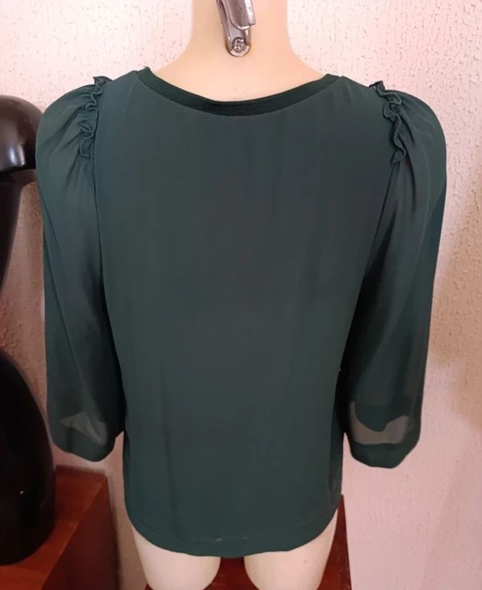 Blouse mango verte double d'une matière très douce devant et derrière. Manches transparente. Petit froufrou sur les épaules.Taille S Très peu porté. Beaucoup d'autre vetements dans mon dressing n'hesitez pas faire un lot pour profiter de reduction.