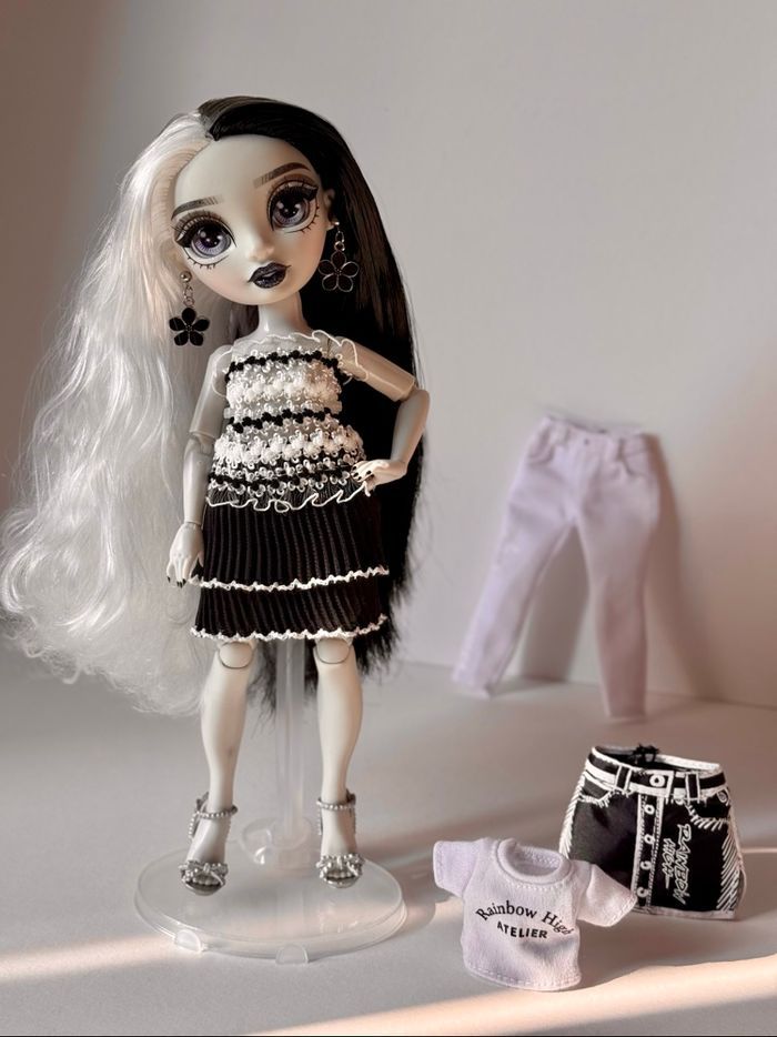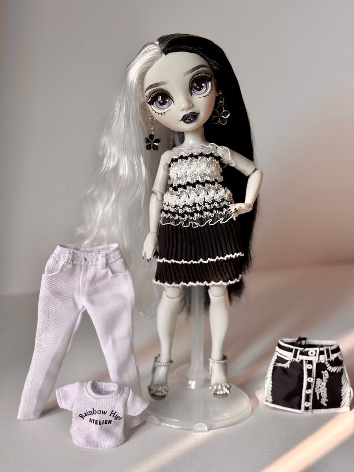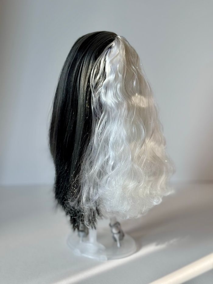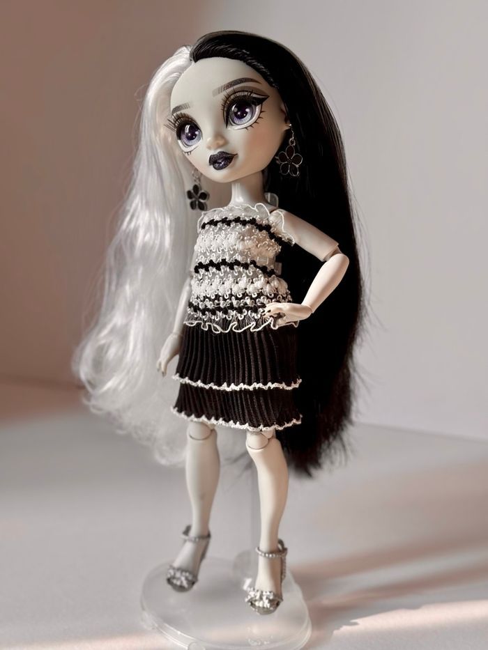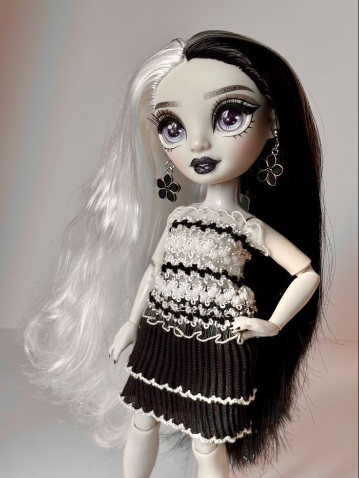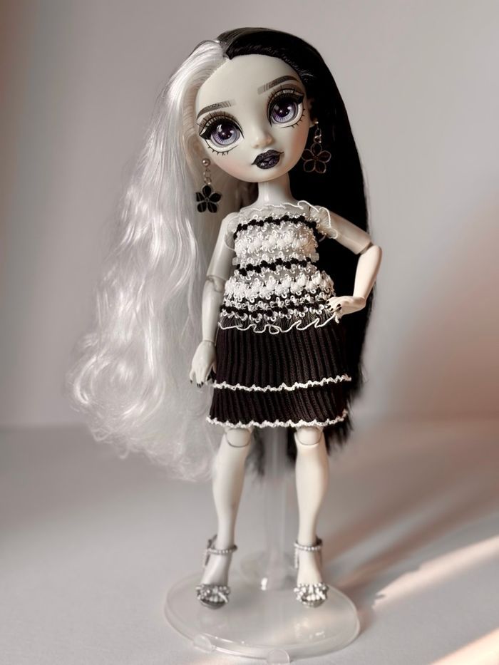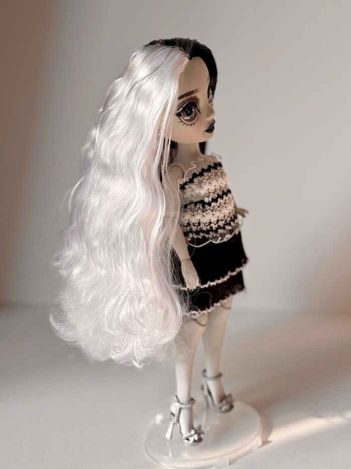 Occasion en bon état. Le côté ondulé de sa chevelure blanche est curieusement naturel ! Robe réalisée par mes soins. Boucles d’oreilles en métal. Socle inclus. Maison non fumeur, envoi rapide et soigné