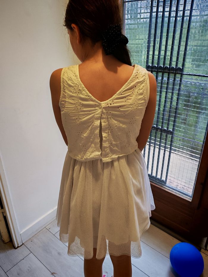 Très jolie robe blanche en Tulle et coton, de marque Vertbaudet, taille 10 ans, il y a une tâche sur le milieu de la robe (voir photo) mais elle est caché par le haut blanc qui se met par-dessus.