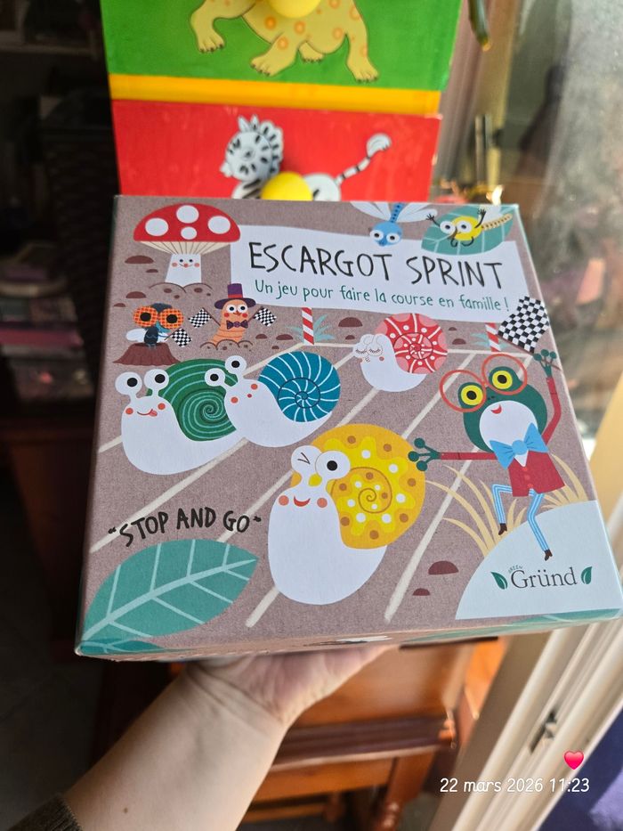 🐌 À vendre : Jeu Escargot Sprint – Complet et en excellent état ! Prix : 15 € Je vends le jeu Escargot Sprint, un super jeu familial dès 6 ans. Le lot comprend : - Le plateau de jeu - Le plateau de compost - Les 6 pions escargots - Les cartes triées et rangées - Les accessoires colorés (cartes, pinces escargots, etc.) - La boîte et la notice Tout est en très bon état, parfaitement adapté pour jouer avec des enfants. 📍 Remise en main propre possible à Croissy-Beaubourg 📦 Envoi possible (frais à la charge de l’acheteur) N’hésitez pas si vous souhaitez plus de photos ou d’informations.