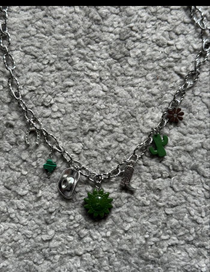 Collier argenté à breloques. Neuf jamais porté car finalement pas mon style. Mesure : 37cm ajustable jusqu’à 40cm. Collier tendance et élégant, thème far west. Acier inoxydable.