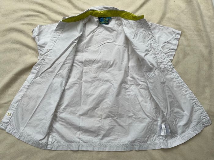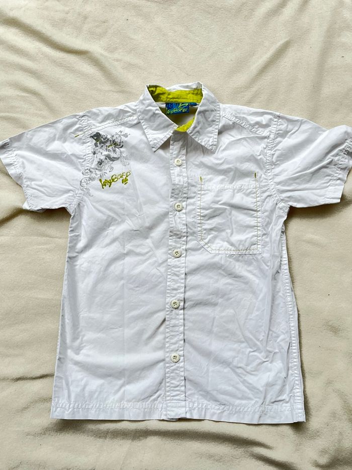 Vends cette Chemise manches courtes marque longboard taille 10 ans Couleur blanc col intérieur vert pomme joli motif gris sur côté droit Demi Largeur Aux épaules 34 cm Longueur 57 cm 3 euros Mes autres annonces de vêtements pour garçon de 8 à 10 ans #lma42femme8 #lma42garcon9 #lma42garcon10