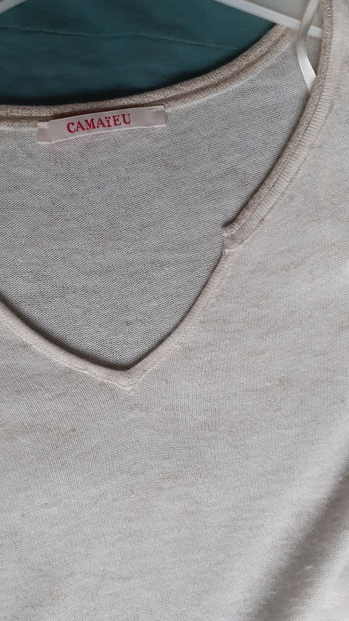 Pull en maille très fin, col en V, en polyester et viscose, léger et doux, couleur crème avec fils dorés, bord de l'encolure doré, marque Camaïeu, taille 34. Longueur de l'épaule à la base : 61 cm Largeur aisselle à aisselle : 41 cm.