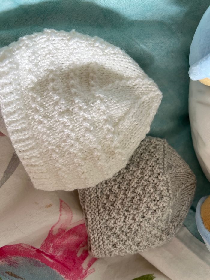 Lot de deux bonnets en laine, spécial, laine, bébé, tricoter main Fais spécialement pour des petits boutchoux prématurés Possibilité d’être fait dans d’autres coloris