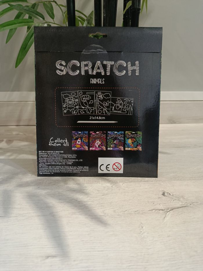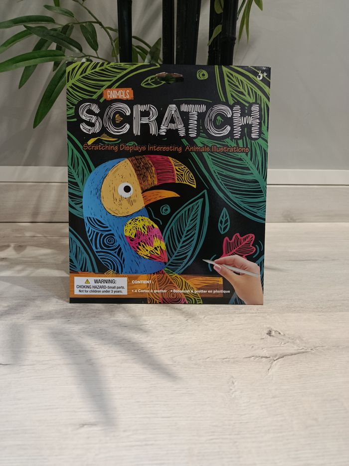 Cartes à gratter animaux de la savane. Neuf sous emballage, ces cartes permettent de travailler la patience et la minutie des enfants. Sont inclus 4 cartes à gratter ainsi qu'un bâtonnet à gratter en plastique. Prix non négociable
